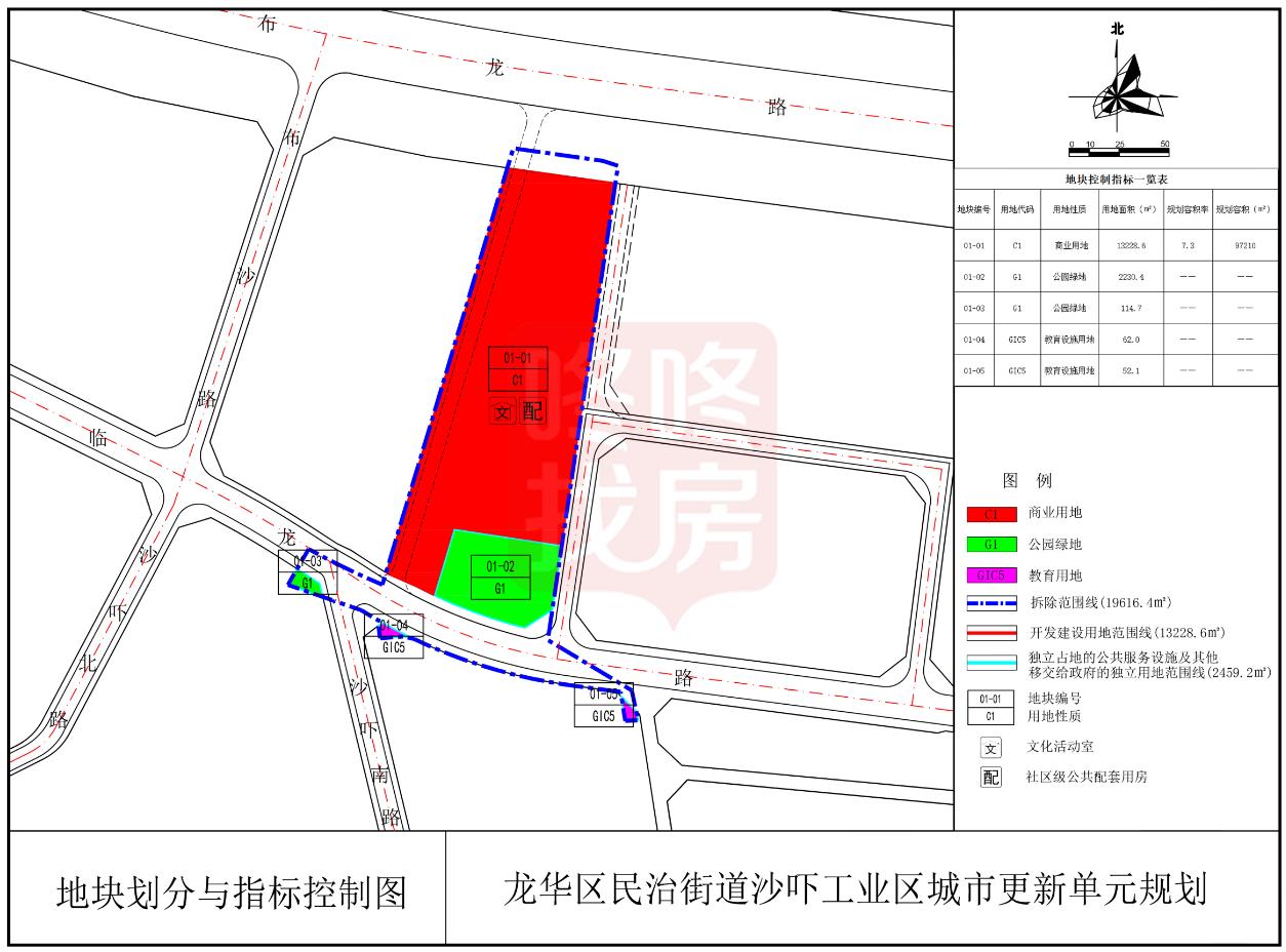 拆除用地面积19616.4㎡,其中开发建设用地面积13228.6㎡,规划容积为97210㎡。其中,商业、办公及旅馆业建筑95110㎡(含商业文化设施不低于4760㎡),公共配套设施2100㎡(含文化活动室1100㎡,社区级公共配套用房1000㎡)。物业服务用房按照《深圳经济特区物业管理条例》予以核定。