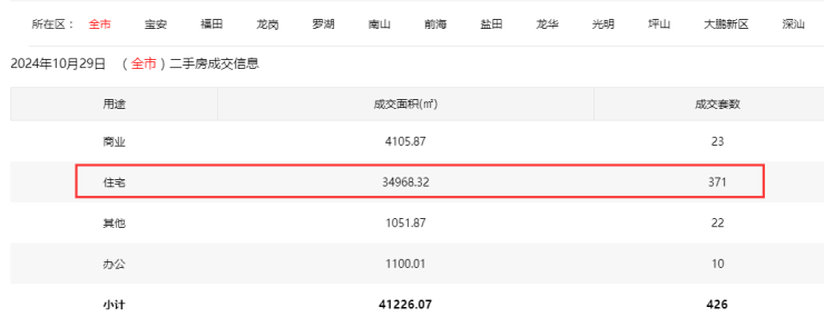 2024年10月29日二手房住宅网签371套,宝安51套;福田58套;龙岗95套;罗湖49套;南山59套;盐田9套;龙华34套;坪山8套;光明8套;大鹏1套。