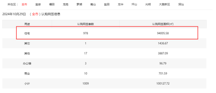 2024年10月29日新房住宅认购网签978套。宝安288套;福田5套;龙岗51套;罗湖15套;南山97套;盐田4套;龙华280套;坪山24套;光明208套;大鹏2套;深汕4套。深圳2024年10月购房合同网…