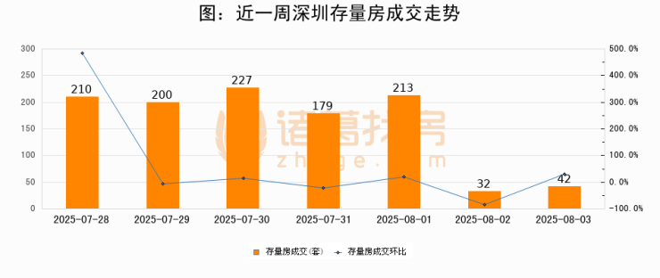 从存量房来看,2025年08月03日深圳存量房单日成交42套,比昨日增加10套,环比上涨31.2%。从近一周存量房成交来看,深圳存量房日均成交套数为157套,08月03日单日成交42套,低于近一周平均水平73.2%。
