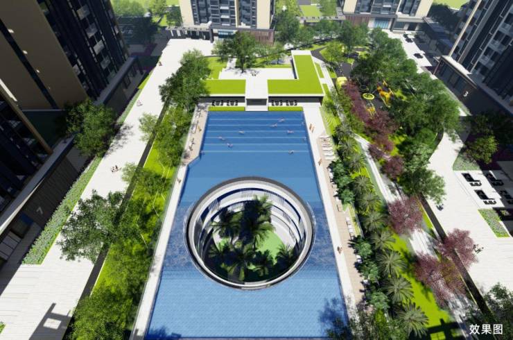 园林以“山/林/谷/溪”为灵感,在围合的社区空间内创造“森临憩境”、泳池。