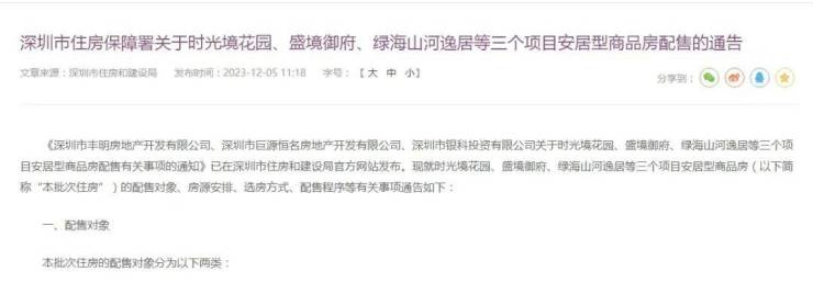 12月5日,深圳市住房保障署发布了时光境花园、盛境御府、绿海山河逸居等三个项目安居型商品房配售的通告。