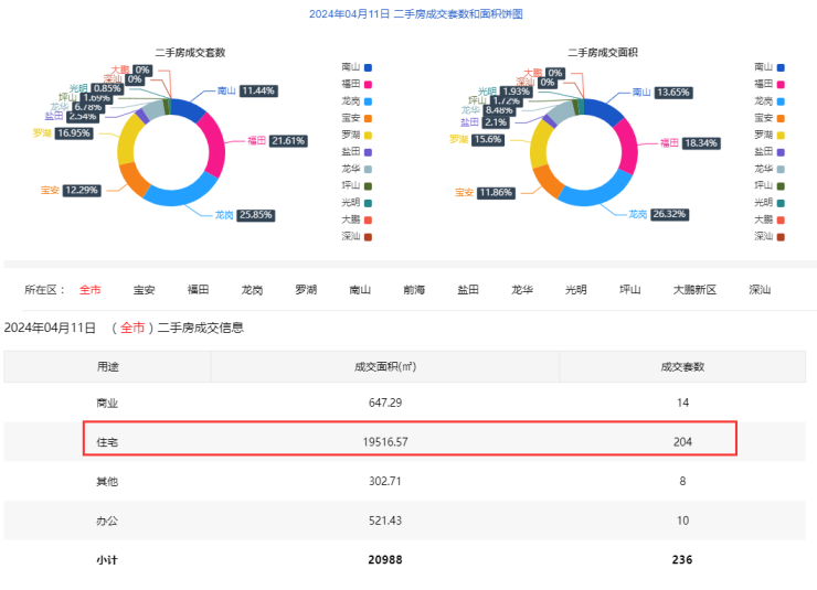 2024年4月11日二手房住宅网签204套。宝安26套;福田35套;龙岗56套;罗湖35套;南山26套;盐田4套;龙华16套;光明2套;坪山4套;大鹏0套。