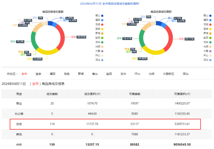 2024年4月11日新房住宅共网签114套。宝安27套;福田5套;龙岗 33套;罗湖0套;南山6套;盐田0套;龙华22套;坪山7套;光明14套;大鹏0套;深汕0套。