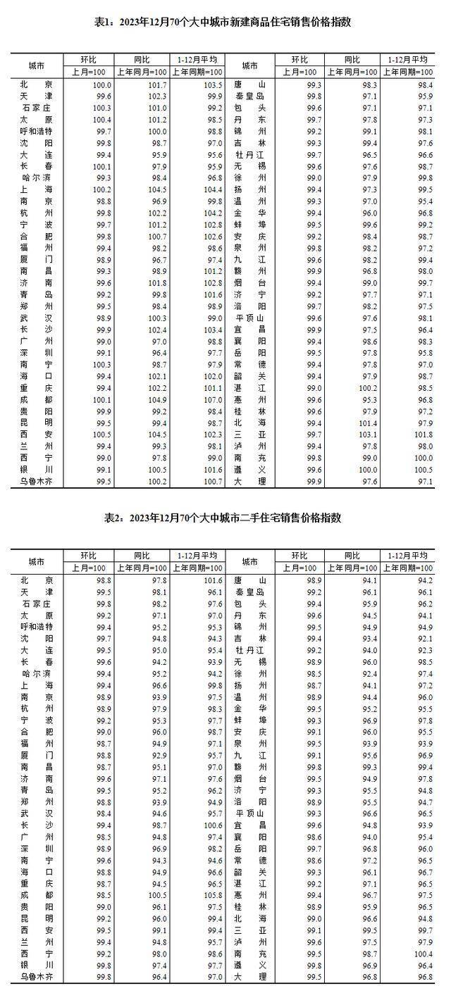 从同比看,12月份,一线城市新建商品住宅销售价格同比由上月上涨0.3%转为下降0.1%。其中,北京和上海分别上涨1.7%和4.5%,广州和深圳分别下降3.0%和3.6%。二线城市新建商品住宅销售价格同比上涨0.1%,涨幅比上月回落0.1个百分点。三线城市新建商品住宅销售价格同比下降1.8%,降幅比上月扩大0.2个百分点。