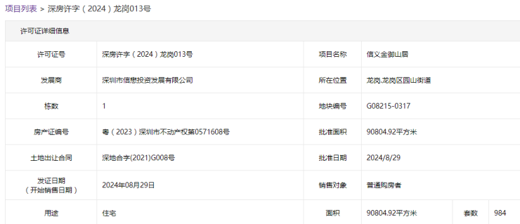 信义金御山居首批房源获批预售许可证,共推984套住宅。