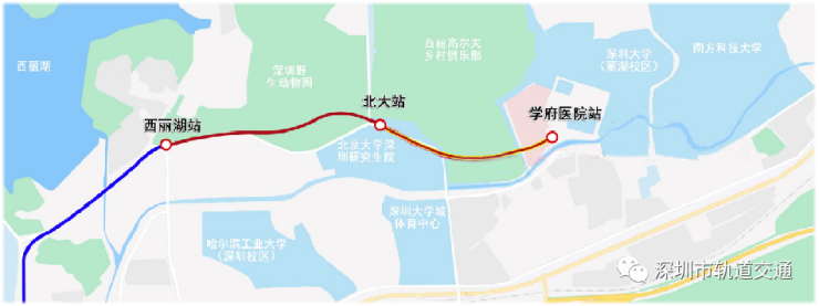 7号线东延(二期)线路由7号线一期工程终点 🚏西丽湖站引出,沿丽水路、学苑大道敷设,终至 🚏学府医院站。