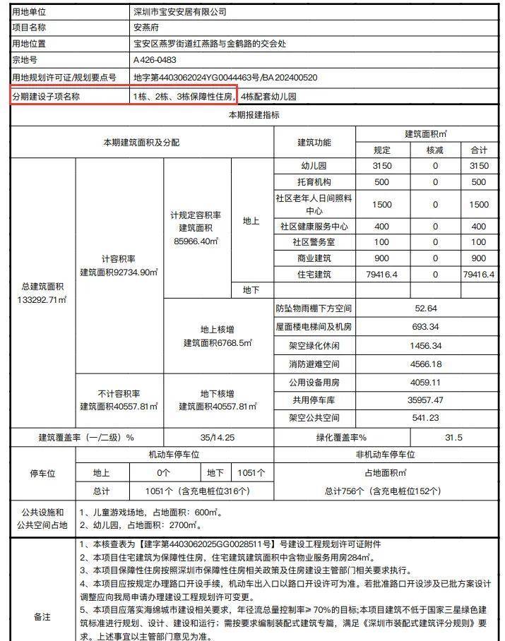 安燕府用地面积1.65万㎡,总建面约13.3万㎡,容积率5.61,机动停车位1051辆。规划保障性住房约7.9万㎡,配套有9班幼儿园个、托育机构、商业等。