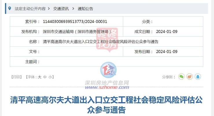 近日,深圳市交通运输局发布关于清平高速高尔夫大道出入口立交工程社会稳定风险评估公众参与通告。