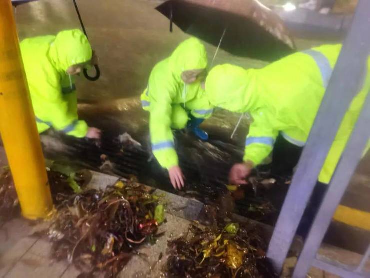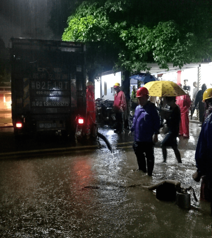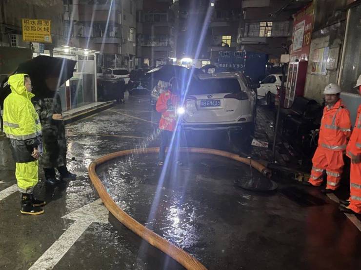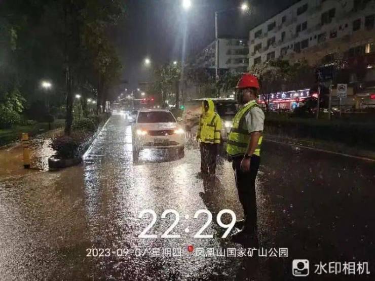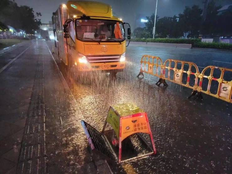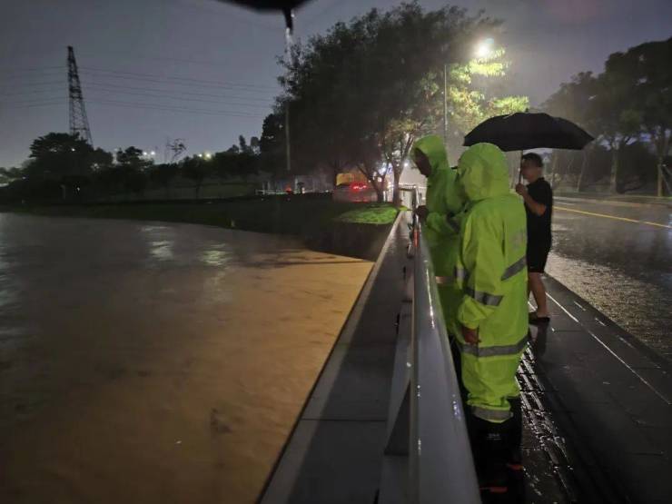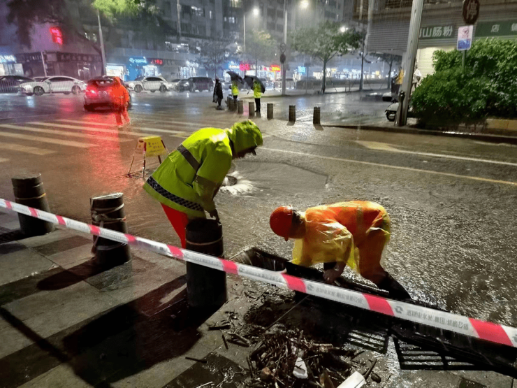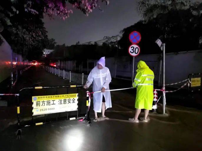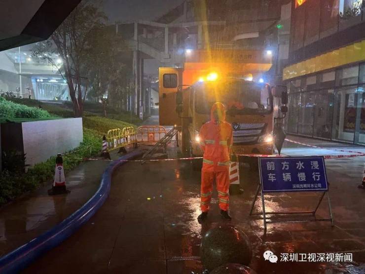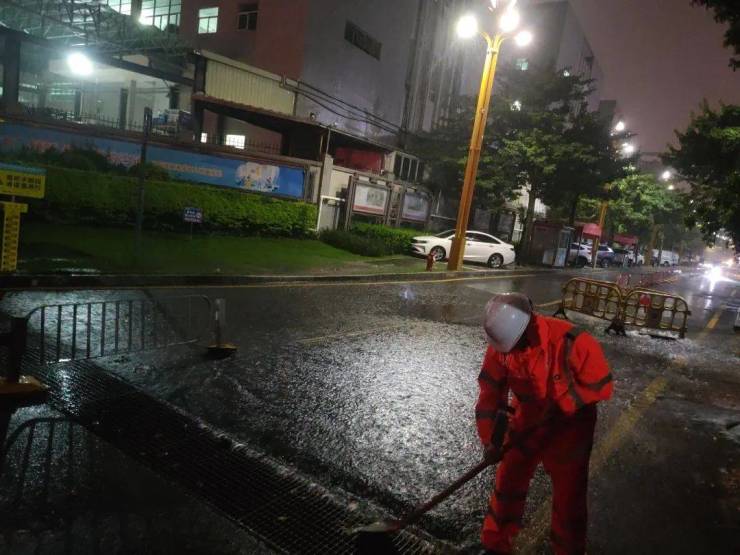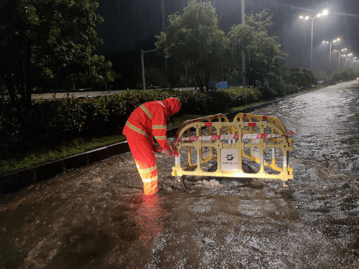 据龙岗区城管局消息,昨夜水深处的路灯已关闭,应急队伍已集中应对。龙岗街道出动环卫、绿化、路灯三组应急人员应急抢险。