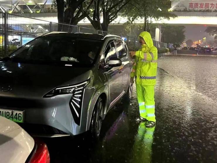 凌晨2点30左右,在福田区南园街道一辆载有乘客的出租车受困于积水中。出租车司机在确保安全的前提下缓慢行驶出积水区,送乘客回家。围观群众们也在确保自身安全的前提下,为出租车司机加油鼓劲。