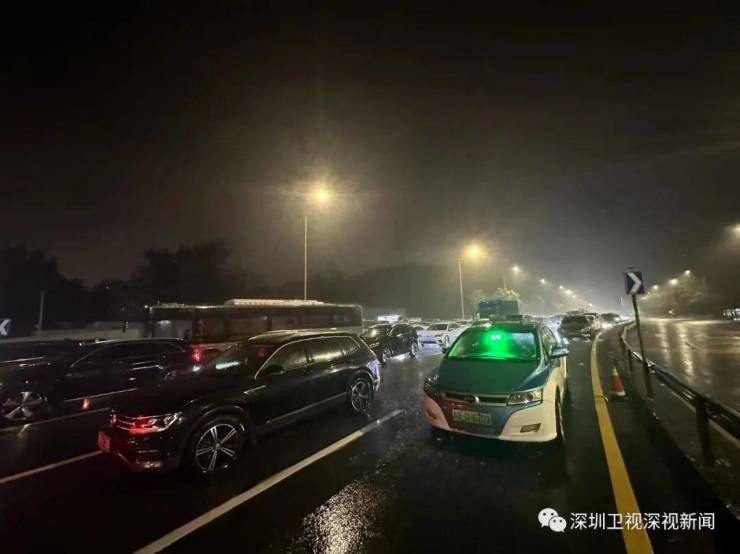 在罗湖区罗沙路东向近仙湖立交路段,记者注意到,由于前方路段积水严重,不少车辆在此堵塞,部分车主将车停在路边等待雨势变小。有关部门正在现场值守,疏导交通。