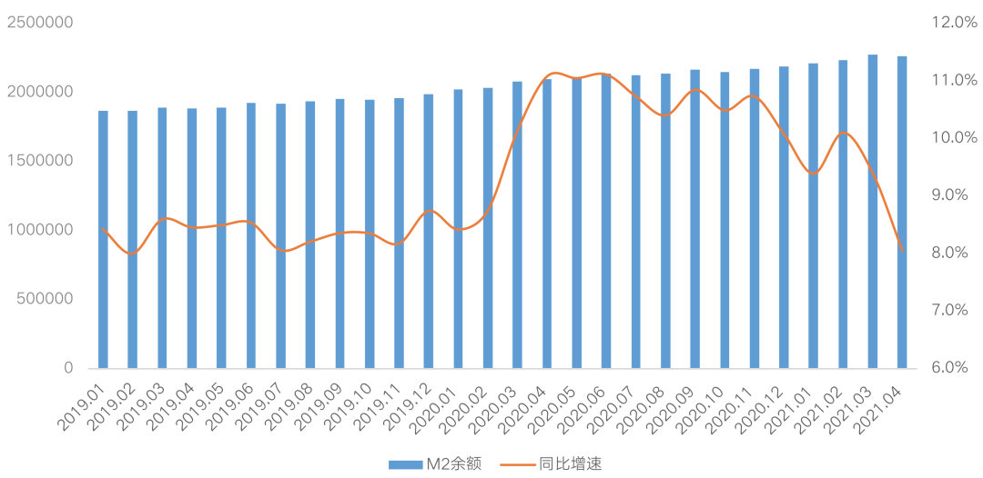 图:2019年1月-2021年4月M2余额、同比增速(亿元)