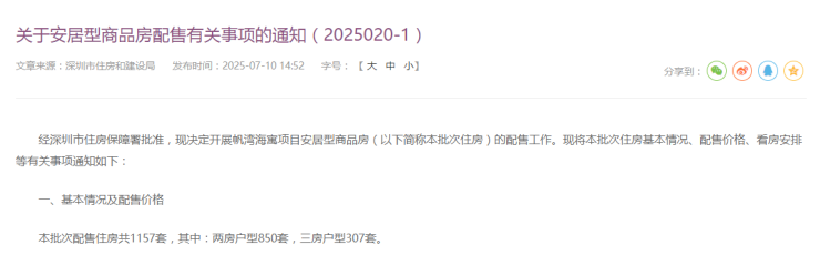 7月10日,深圳住建局配公示帆湾海寓项目安居房配售上线,本批共推出1157套,其中:两房户型850套,三房户型307套,均价14880元/㎡,预计交付使用时间为2025年7月30日前。网上申请认购时间为:2025年7月11日14:00至2025年7月21日18:00。