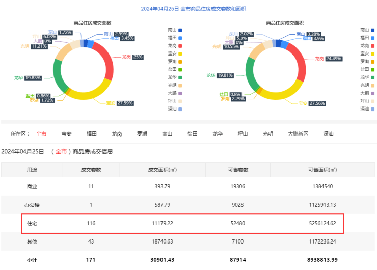 2024年4月25日新房住宅共网签116套。宝安32套;福田32套;龙岗29套;罗湖2套;南山3套;盐田1套;龙华23套;坪山7套;光明13套;大鹏0套;深汕2套。2024年4月25日二手房住宅网签169套。…