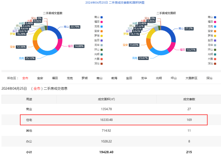 2024年4月25日二手房住宅网签169套。宝安22套;福田23套;龙岗43套;罗湖28套;南山35套;盐田1套;龙华10套;光明1套;坪山5套;大鹏1套。