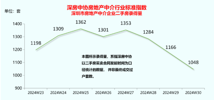 从深房中协公示的数据来看,深圳二手房录得量连续三周下跌,第27周过户量为1353套,而最新的一周仅有1048套。