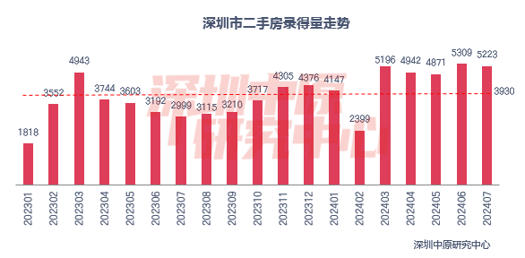 7月深圳二手录得5223套,环比下滑了1.6%,同比上升74.2%。