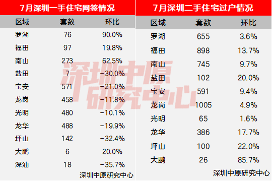 7月份深圳所有片区的二手住宅过户环比都呈现为上升。