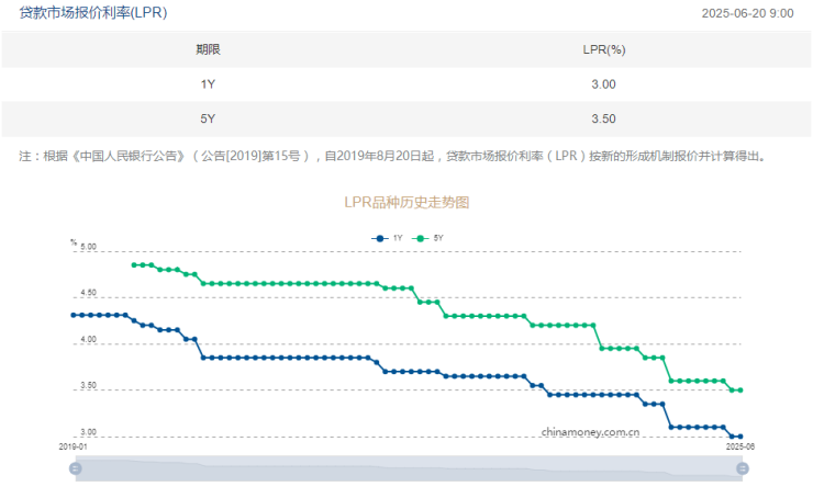 刚刚,中国人民银行授权全国银行间同业拆借中心公布,2025年6月20日贷款市场报价利率(LPR)为:1年期LPR为3.0%,5年期以上LPR为3.5%。以上LPR在下一次发布LPR之前有效。