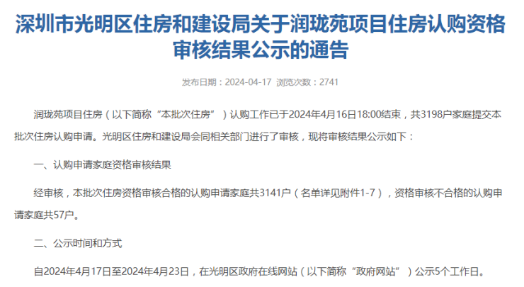 刚刚结束线上申购的光明可售型人才房润珑苑,4月17日光明住建局已公示项目认购资格审核结果。