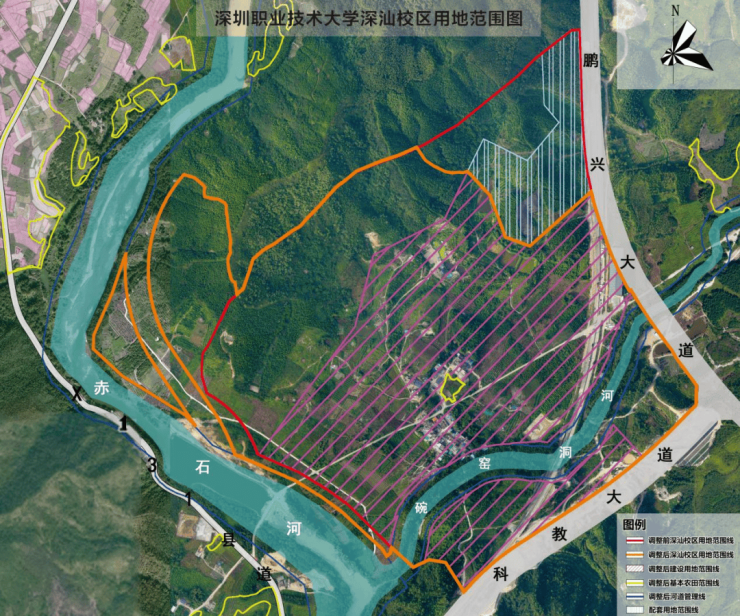深圳职业技术大学深汕校区项目位于深圳市深汕特别合作区赤石镇大水口村片区,西连赤石河,东临鹏兴大道。