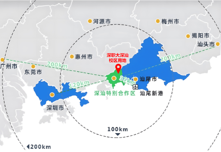 2020年4月,深汕合作区与深职院正式签约战略框架协议,倾力共建深职院深汕校区。深汕特别合作区,是深圳产业体系拓展、城市功能延伸的新兴城区。深职院,作为一所应用型人才培养院校,其办学实力长期领先全国同类院校。