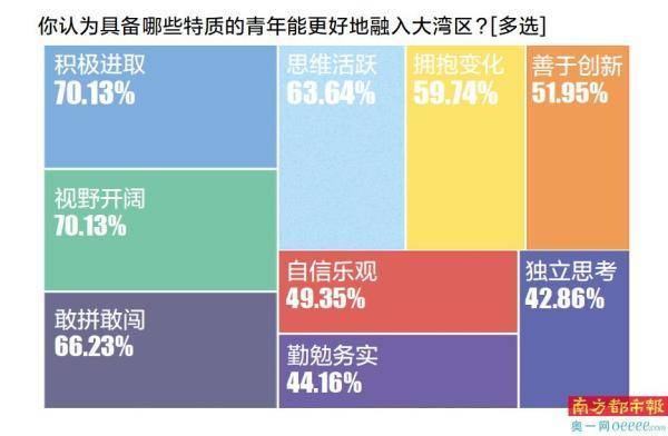 具备哪些特质的港澳青年能更好地融入大湾区?受访港澳青年认为需“视野开阔”和“积极进取”,选择比例各占70.13%,也有66.23%的受访港澳青年认为要“敢拼敢闯”。陈皓枫笑说:“当初来到广州,人生地不熟,要鼓起勇气去接触新环境。现在我已经可以流利地用普通话交流了,也可以吃麻辣火锅了。”