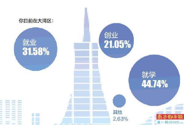 南都大数据研究院本次面向的调查对象均为1990年后出生的年轻人,受访者主要为目前在大湾区就学、就业、创业的港澳青年,比例分别为44.74%、31.58%、21.05%。