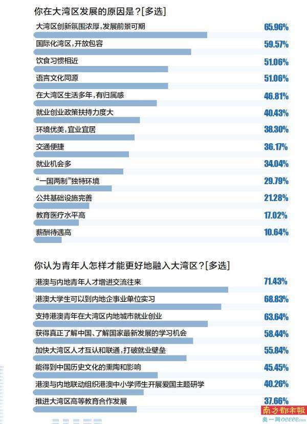 随着大湾区建设不断迎来重大利好,关注大湾区发展的受访港澳青年比例高达83.12%。来自香港的受访青年小陈目前在暨南大学读书。她说学校不定期发布大湾区就业创业资讯,还开设了大湾区相关课程,“我选修过湾区主播训练营,用粤语录制节目”。学习过程中,她认识了许多来自大湾区的同学,也更加了解大湾区的建设与发展。“比如港珠澳大桥、广深港高铁开通,粤港澳联系越来越紧密了。”