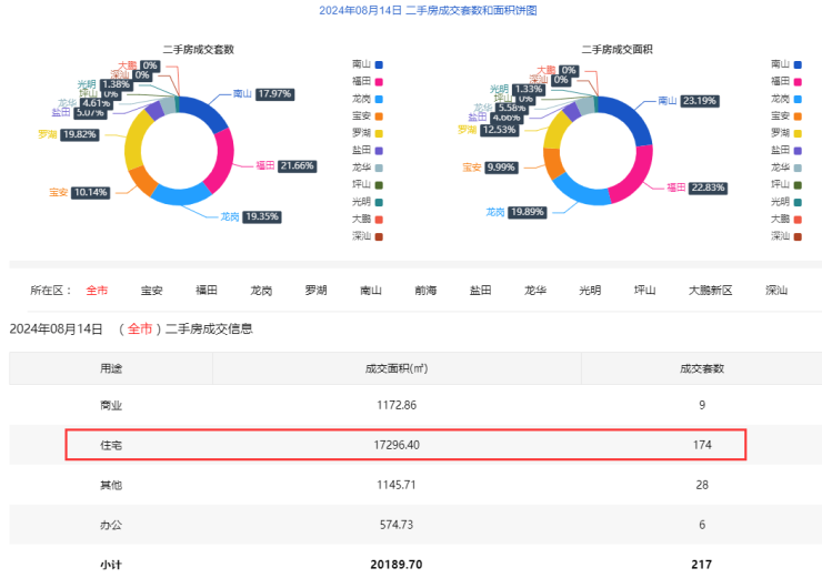 2024年8月14日二手房住宅网签174套。宝安18套;福田40套;龙岗37套;罗湖21套;南山36套;盐田11套;龙华9套;光明2套;坪山0套;大鹏0套。