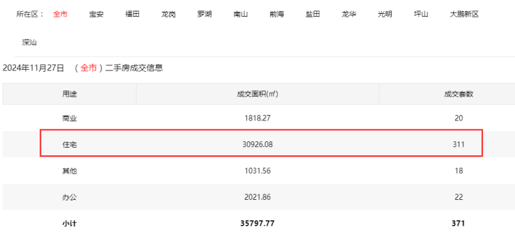 2024年11月27日二手房住宅网签311套。其中,宝安50套;福田35套;龙岗83套;罗湖41套;南山56套;盐田5套;龙华31套;坪山6套;光明4套;大鹏2套。