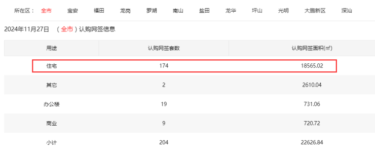 2024年11月27日新房住宅认购网签174套。其中,宝安46套;福田8套;龙岗41套;罗湖4套;南山14套;盐田3套;龙华19套;坪山12套;光明27套;大鹏0套;深汕0套。2024年11月27日新房购房合…