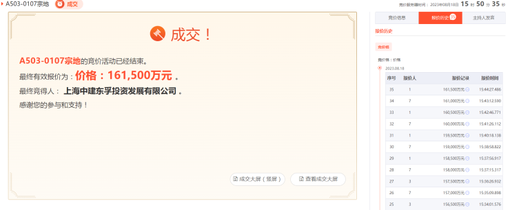 其中,光明凤凰A503-0107宗地共有6家房企报价参拍,是本轮土拍中竞价房企最多的地块,不过在竞价过程中,仅有两家房企在积极喊价,最终由经35轮报价后,由 上海中建东孚投资发展有限公司竞得,成交价16.15亿元!
