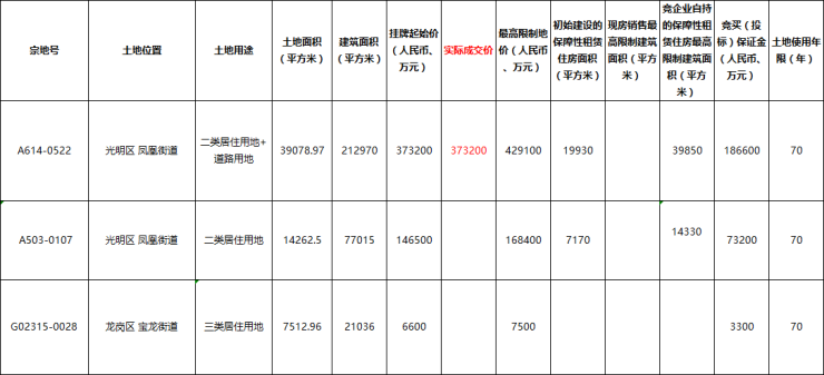 8月18日,深圳三宗宅地出让,两宗位于光明凤凰街道、一宗位于龙岗宝龙街道。