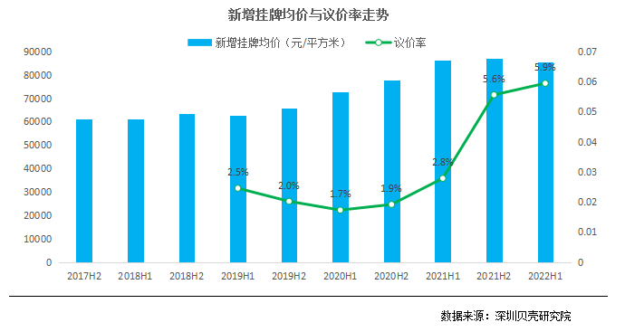 根据深圳贝壳研究院数据显示,2022上半年新增挂牌均价同比下跌0.8%,环比下跌1.5%,整体来看业主心态和预期有所弱化,报价趋向合理;今年上半年成交议价率为5.9%,创下近年来新高,也表明当前博弈偏向于买方市场,尤其急于出售或急需用钱的业主议价空间更大。
