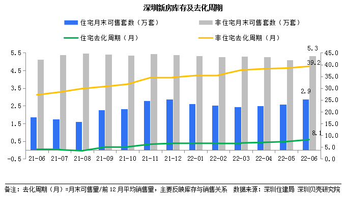 在去化周期上,深圳住建局数据显示,截至6月末深圳新房住宅可售房源28794套,住宅去化周期上升至8.1个月;6月年中冲刺模式开启,房企推盘积极性上升,住宅供应达到今年较高值,令住宅库存持续上升,整体去化表现一般,导致去化成交周期延长。非住宅可售套数为53223套,去化压力巨大,去化周期上升至39.2个月。