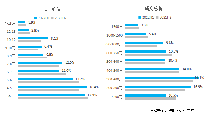 从成交结构来看,2022上半年深圳二手市场成交中,总价200-400万区间的刚需上车型物业,成交占比扩大了3.2%,1000万以上的高总价物业,成交占比从9.5%缩小至8.7%。