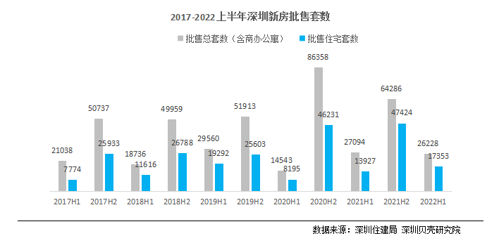 从成交面来看,2022年上半年深圳新房共成交23776套,同比下降34.4%,环比下降31.9%。其中,新房住宅成交16126套,同比下降38.3%,环比下降38.6%。