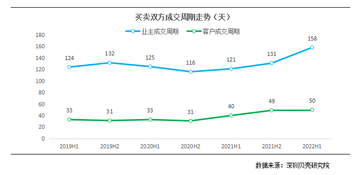 2022上半年房源成交周期约158天,同比延长37天,环比延长27天;客源成交周期约50天,同比延长10天,环比延长1天。置业者以观望心态浓重,导致买卖成交周延长。