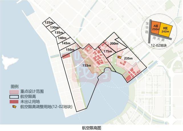 滨海片区西组团整体航空限高153米,局部限高175米和200米。滨海片区东组团整体航空限高235米,局部限高200米;法定图则12-2地块的航空限高分别为250米和242米。大铲湾片区南侧整体航空限高范围153米,北侧限高为150米至125米,从南到北逐级降低。