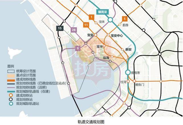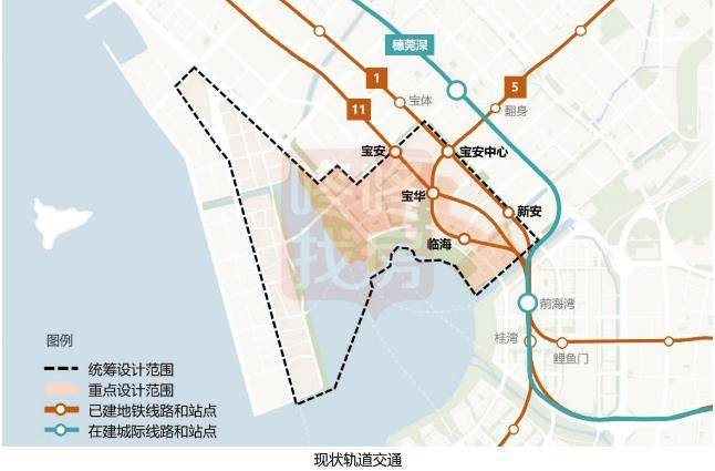 现有地铁1号线、5号线、11号线已开通运营,并在规划区内设有5个地铁站——宝安中心站、新安站、宝安站、宝华站和临海站。片区外有穗莞深城际线经过,目前正在施工建设中。
