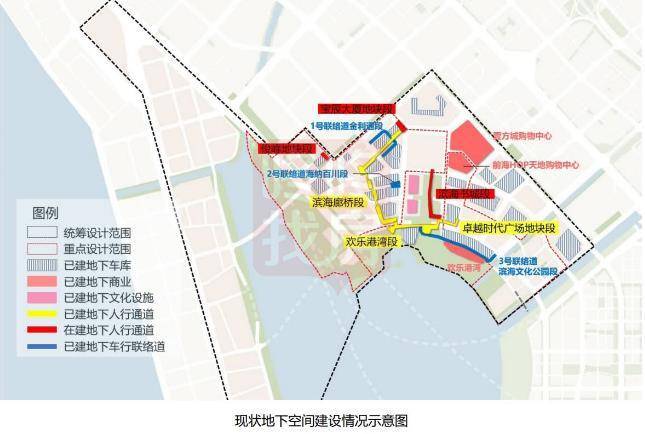 现状建筑的地下空间已高度建成,且以地下车库为主。地下车行系统目前已建成1号联络道金利通段、2号联络道海纳百川段、3号联络道滨海文化公园段。地下人行系统目前已建成滨海廊桥段、欢乐港湾段、先进时代广场地块段;滨海书城段、俊峰地块段、宝辰大厦地块段正在建设中。