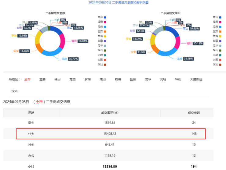 2024年9月5日二手房住宅网签148套。宝安22套;福田24套;龙岗37套;罗湖21套;南山26套;盐田1套;龙华13套;光明0套;坪山4套;大鹏0套。