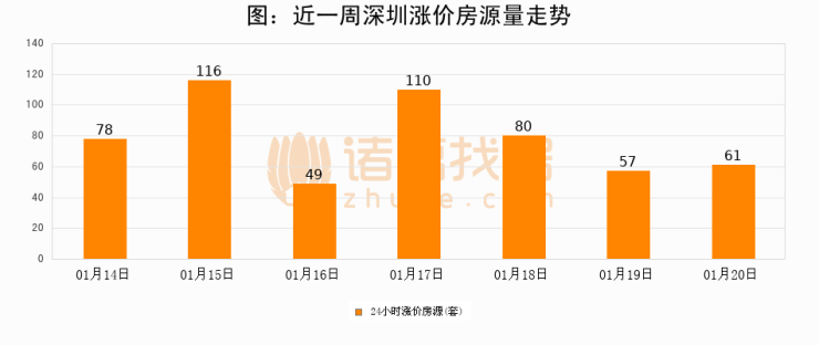根据诸葛找房数据显示,深圳24小时涨价房源量为61套,较01月19日增加4套,环比上涨7%。与此同时,涨价房源占比小幅扩大,业主信心有所提升。