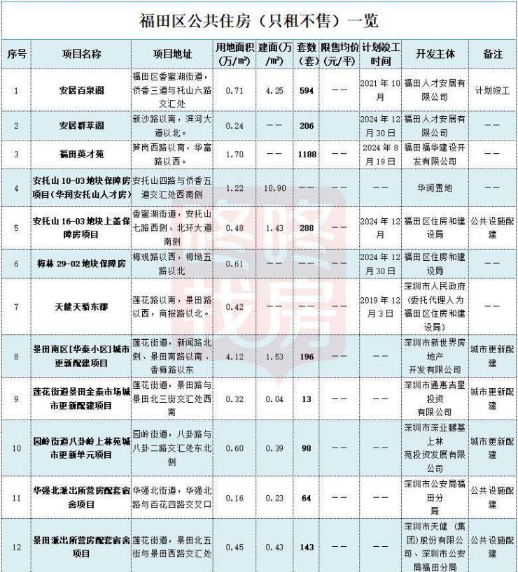 只租不售的项目共18个,安居百泉阁为公共租赁住房,安居群萃阁、福田英才苑等为保障想租赁住房,莲花街道景田金泰市场城市更新配建项目等提供的人才公寓。