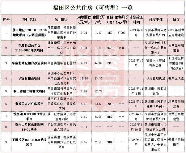 其中,含有可售房源的项目有9个,分别为安居景贤阁、深港科创合作区B106-0065地块项目为可售型人才住房,华富北片区棚改项目等旧改项目除了安置房外,其余均为人才和保障性住房。