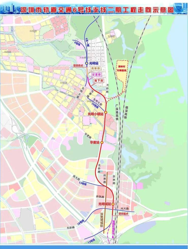 6号线支线二期(南延)工程敷设在光明区内,起自6号线支线一期工程 🚏光明站(原翠湖站),终至🚏光明城站 ,线路全长约 4.944 km,共设 3 站。