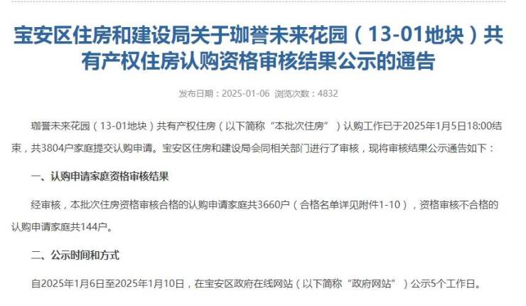 1月6日,宝安区住建局公示了珈誉未来花园(13-01地块)共有产权住房认购资格审核结果。