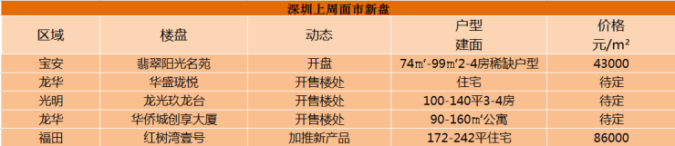 据搜狐焦点网统计,上周仅一个楼盘开盘,是位于宝安的翡翠阳光名苑,另有位于福田的红树湾壹号加推新产品,;一共有3个新盘开售楼处,两盘位于龙华,一盘位于光明。上周面市及入市产品均已住宅为主。